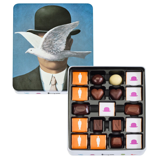As the inventor of the Belgian praline, we honour René Magritte, one of Belgium's most famous artists, by creating a unique and artistic collection. The Magritte box (191G) is a tin box with the famous painting 'Man in the bowler hat'