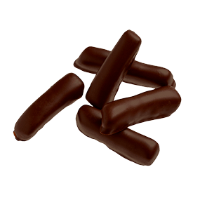 Candied ginger enrobed in dark chocolate.