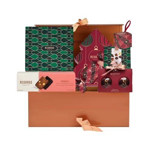 The Festive Sharing Box (822 g) contains a carefully selected variety of 62 milk, dark and white chocolates. Slide the box open to reveal 2 layers of our most timeless Neuhaus pralines picked with great care by our Maîtres Chocolatiers.