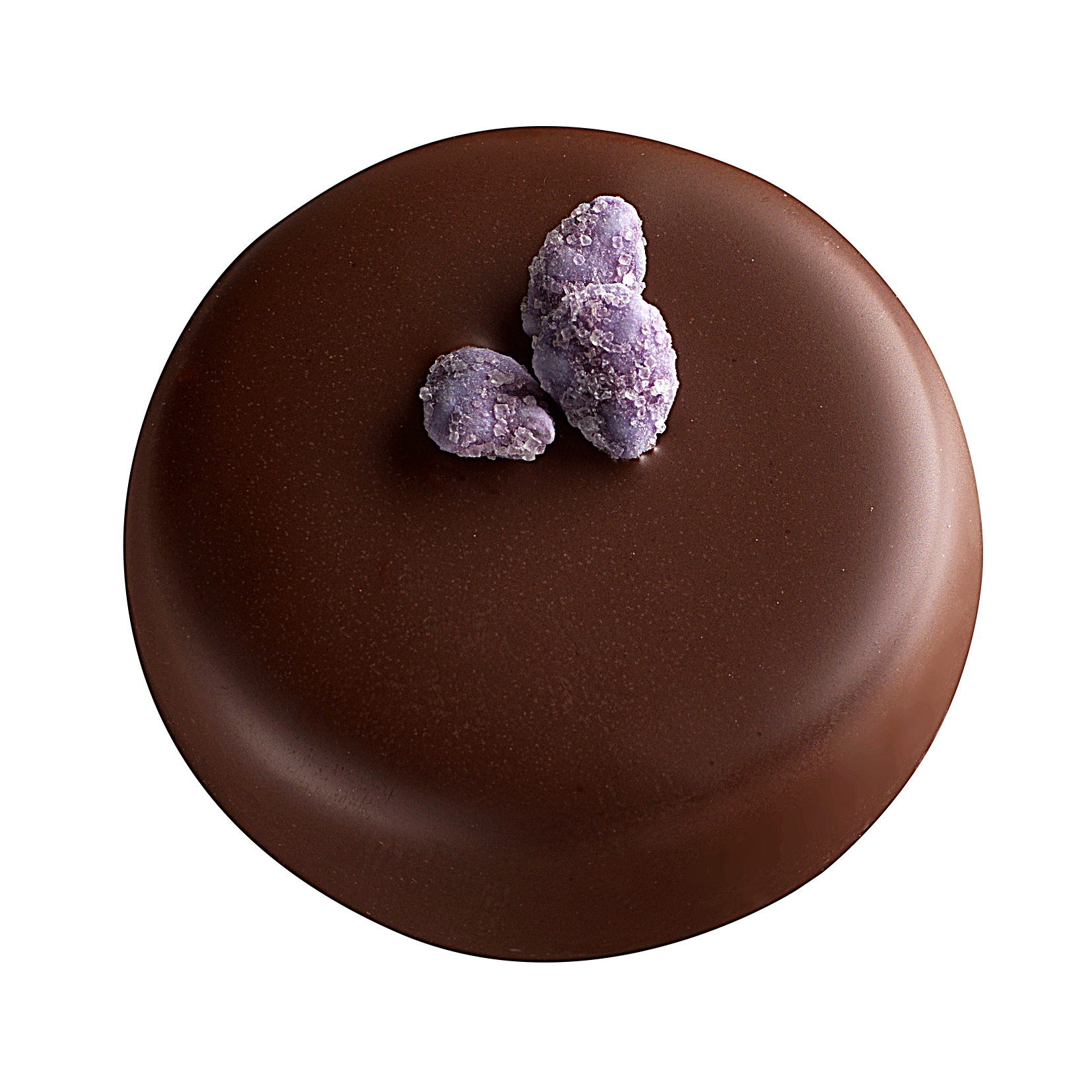 Chocolat noir, fourrée d'une ganache à la violette et décorée de véritables pétales de violette, provenant de la France, cristallisées.