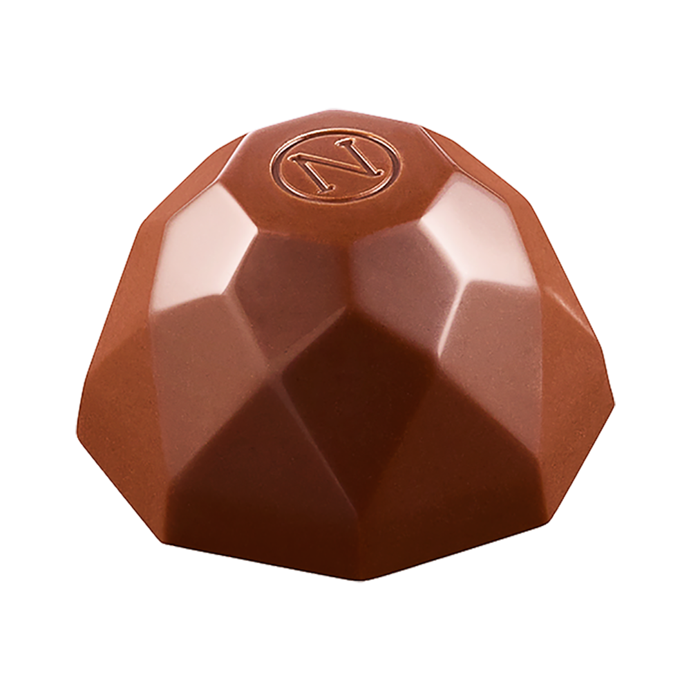 Ganache aux noisettes au rhum, chocolat noir, recouvert de chocolat au lait.