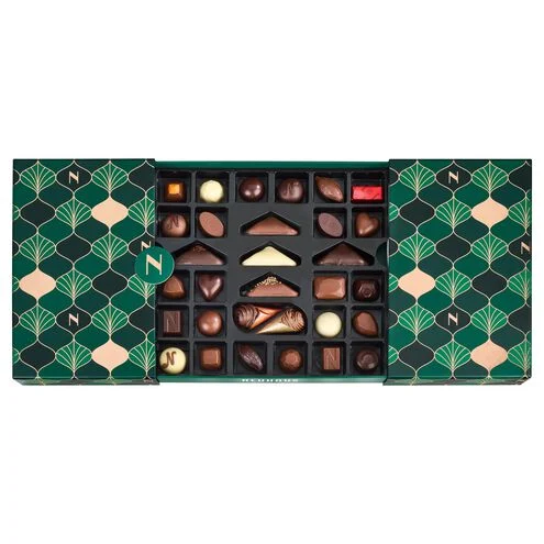 Emballé dans une boîte festive en forme de sapin vert et or, ce coffret est le cadeau idéal pour les amateurs de chocolat.
