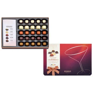 Le coffret cadeau Chocolat Cocktails (273 g) contient 25 chocolats à la liqueur réinventés. Cinq chocolats dédiés aux cocktails (Gin, Rhum, Sake, Vodka, Whisky) créés par des mixologues belges et nos Maîtres Chocolatiers Neuhaus, inspirés par des cocktails emblématiques.
