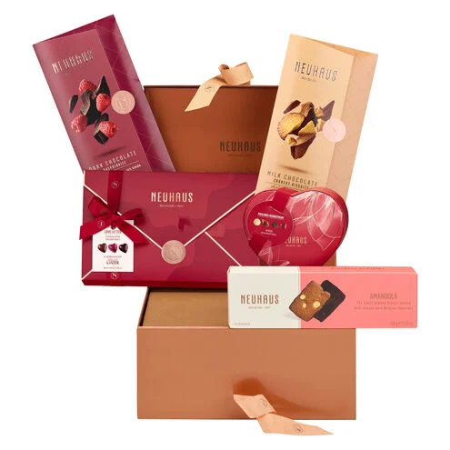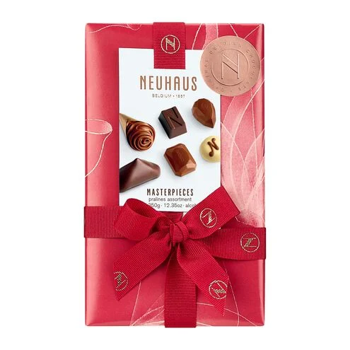 Le Ballotin Timeless Masterpieces Saint-Valentin (350 g) contient +/- 30 chocolats Neuhaus emblématiques ; une sélection de pralines fourrées à la crème fraîche, au praliné, à la ganache ou au gianduja.