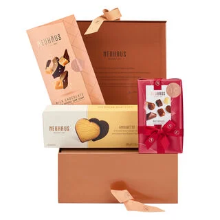 La petite boîte cœur de la Saint-Valentin (185 g) renferme 16 chocolats emblématiques de Neuhaus, une sélection exquise de pralines aux cœurs moelleux, garnies de praliné, ganache, caramel et gianduja. En guise de surprise, cette boîte renferme également 3 chocolats en forme de cœur, édition limitée, conçus par nos Maîtres Chocolatiers en collaboration avec le célèbre chef belge Mallory Gabsi. Une expérience gustative qui fera fondre toutes les papilles.