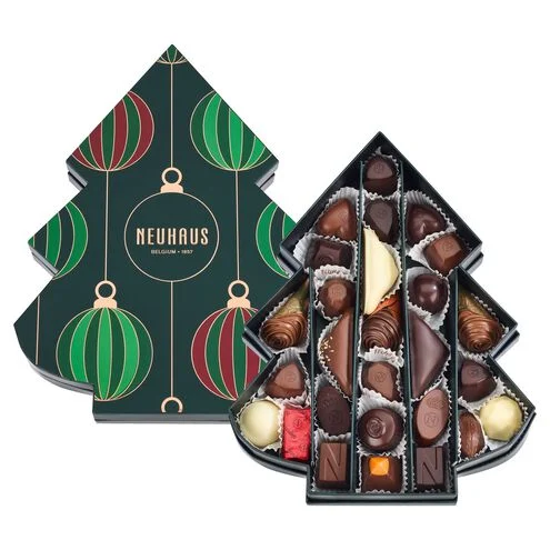 The Christmas Tree Box (335 g) contains an assortment of 27 timeless Neuhaus milk, dark and white filled chocolates.