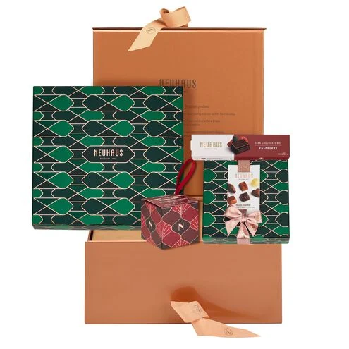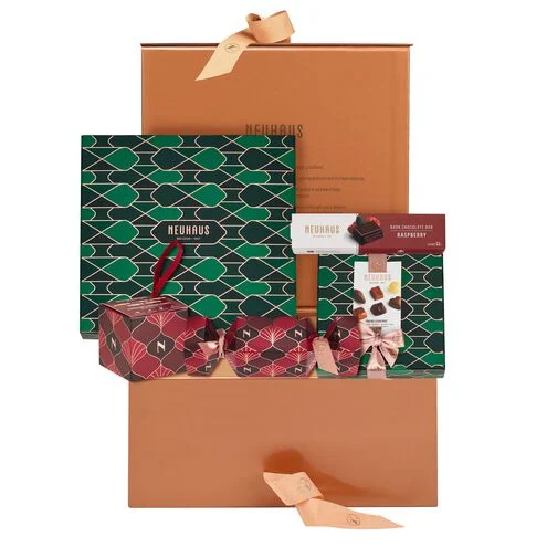 The Festive Sharing Box (822 g) contains a carefully selected variety of 62 milk, dark and white chocolates. Slide the box open to reveal 2 layers of our most timeless Neuhaus pralines picked with great care by our Maîtres Chocolatiers.