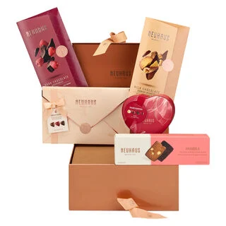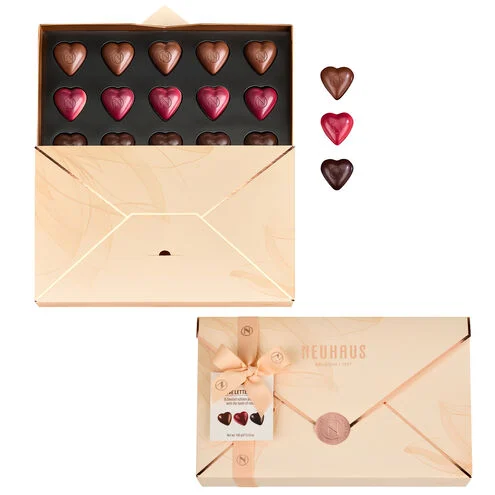 The Valentine Small Heart Box (185 g) contains 16 iconic Neuhaus chocolates; a selection of soft praliné, ganache, caramel and gianduja filled pralines. Beautifully arranged in a heart-shaped box, you can also discover the three limited edition rose-inspired chocolate hearts, created by our Maîtres Chocolatiers with the renowned Belgian flower chef Lieven Lootens (‘t Aards Paradijs), that will delight your senses.