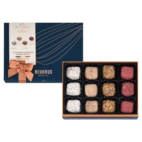 Le petit coffret Les Trésors de Neuhaus (201 g) contient 12 pralines gastronomiques. Quatre truffes uniques imaginées par les plus grands chefs étoilés belges Peter Goossens, Yves Mattagne, Lionel Rigolet et Thierry Theys en collaboration avec nos Maîtres Chocolatiers.