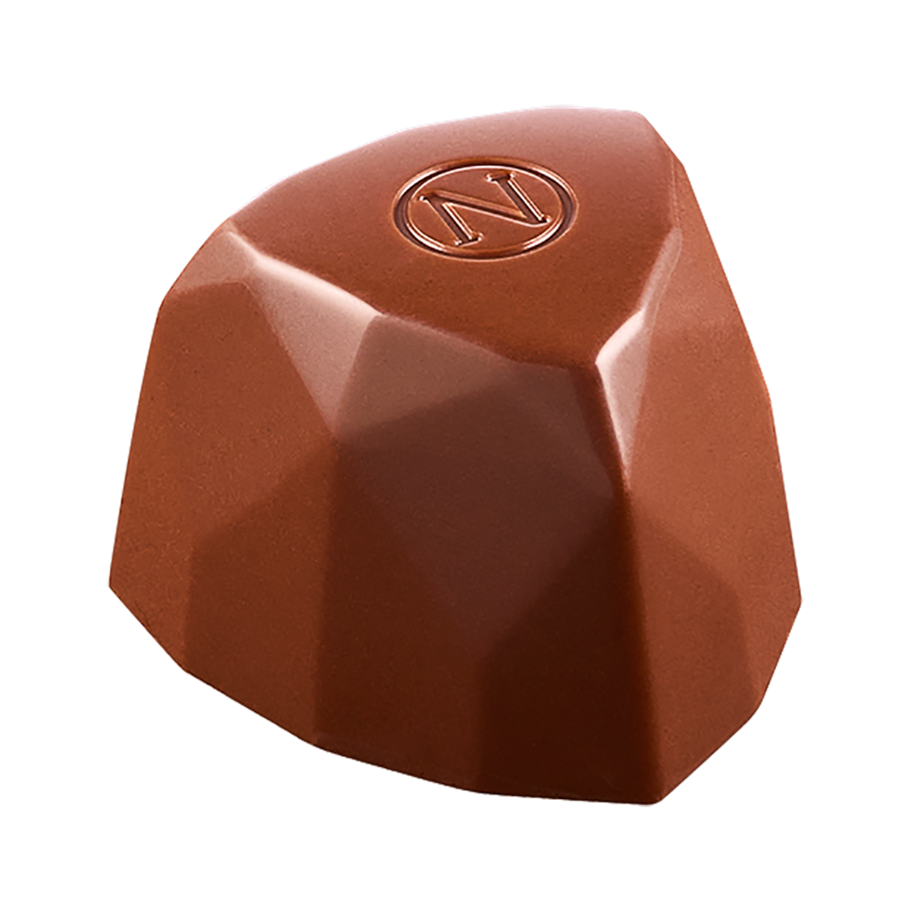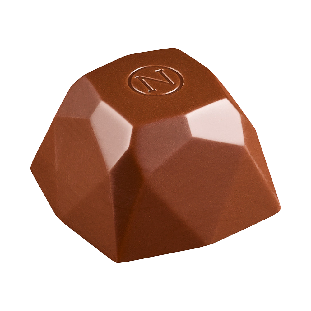 Ganache aux noisettes au rhum, chocolat noir, recouvert de chocolat au lait.