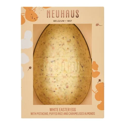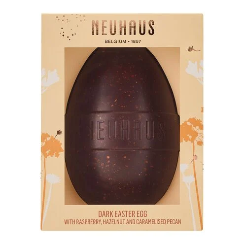 Le Grand Œuf de Pâques (362 g) contient un large assortiment de 30 chocolats Neuhaus emblématiques composé d'une variété de pralines avec praliné, ganache et gianduja ainsi qu'une rangée de nos œufs de Pâques. Cette boîte d’œuf de Pâques colorée avec un imprimé floral est parfaite comme décoration de table ou à partager avant ou après un brunch de Pâques.